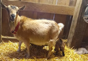 Starlet delivers her kids without difficulty, usually twins, occassionally triplets. Excellent mothering skills. Udder fills well and is easy to milk. Starlet cooperates on the stand as long as you don't dilly-dally around so make sure you have what you need in place before you put her on the stand.